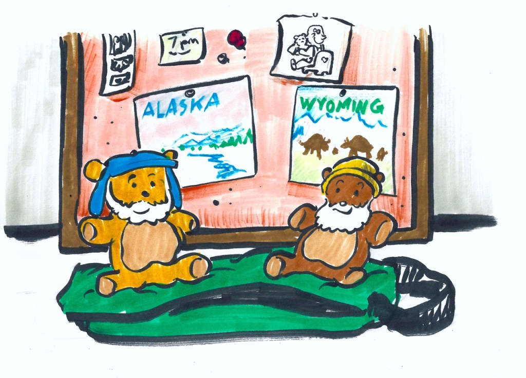 But don’t worry about them. They always wear warm hats—Teton’s is trimmed in blue and Denali’s in yellow—and they were born with full beards that keep them extra warm!