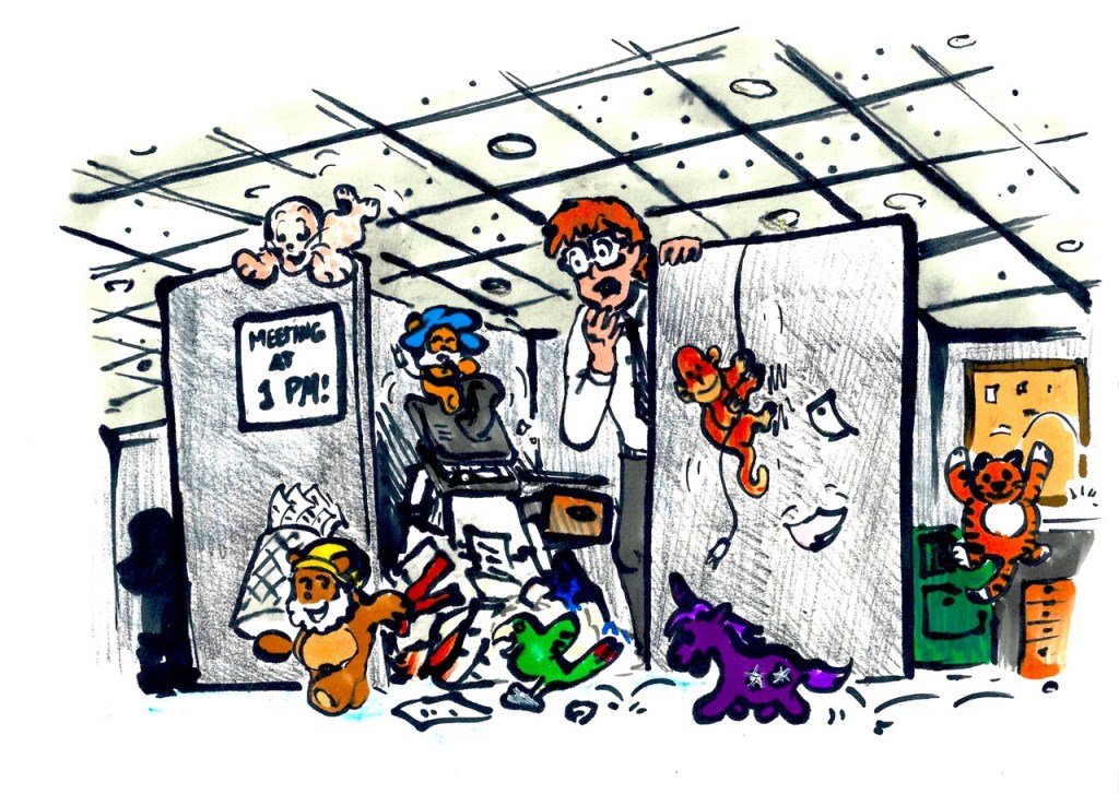 It isn’t that strange. Well, maybe it’s a little strange, but lots of people he works with have stuffies at their desks. Those critters just don’t go home at night.