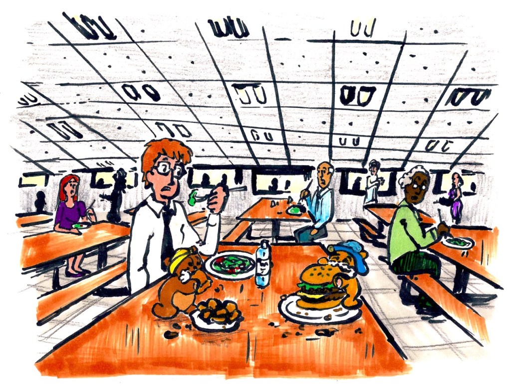 While the polite gentry nibble salads with fat-free dressing, Teton and Denali each gobble a double cheeseburger and a large order of “those lil ‘taters that look like hay bales,” as Teton puts it (he means tater tots). The entire office is aghast.